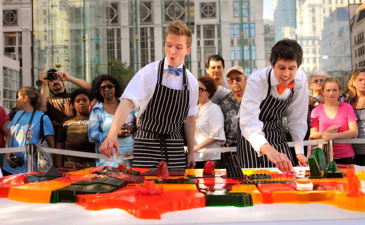 Bompas & ParrSam Bompass and Harry ParrBompas & Parr is a creative studio made up of artists, architects, chefs, designers, marketeers, strategists and technologists. Through consultancy, delivering Location Based Experiences (LBEs) and writing publications, the studio challenges the world around us with radical creativity and a thirst for provoking innovation. The studio works with cultural institutions, attractions, governments, developers and brands to deliver this work.There are some examples of their work below.St. Paul’s CathedralLondon-based artists Sam Bompas and Harry Parr have been pushing the limits of what can be done with jellies (the British term for anything set with gelatin) over the past few years. St. Paul’s Cathedral is one of the architectural creations featured in their new book Jellymongers, just out in the U.S.Neon Jelly Chamber, London, March 2011This neon jelly creation was made using the secret ingredient used to dye the Chicago River green each year. The installation was inspired by Antonin Careme, known as the “king of chefs and chef to kings,” who cooked for Napoleon, George IV, and Tsar Alexander, often moulding food into architectural shapes.