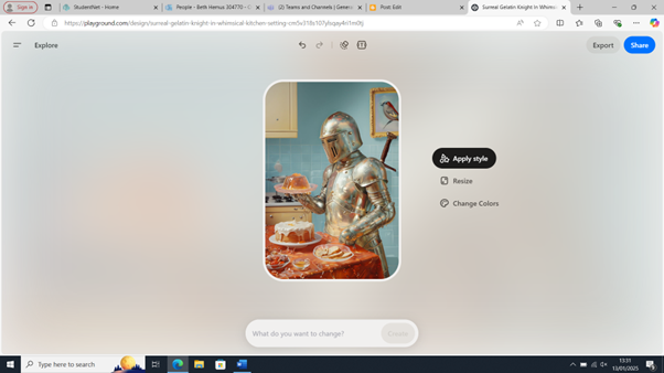 Kate Whyles: AI guest lectureDuring our lecture Kate introduced us to Leonardo AI and Playground, software that employs AI in image generation and animation. This is with a view to incorporating them in our Nottingham castle VR project. We had the opportunity to experiment with both for free and so I used some of my initial ideas for the project. See below. Playground is pitched at a lower level then Leonardo AI, with the latter being at industry level. Someone suggested Sora AI (https://openai.com/sora/) for my animated AI elements as it’s at the foreground of that emerging tech. Will do. You can find both programs at: