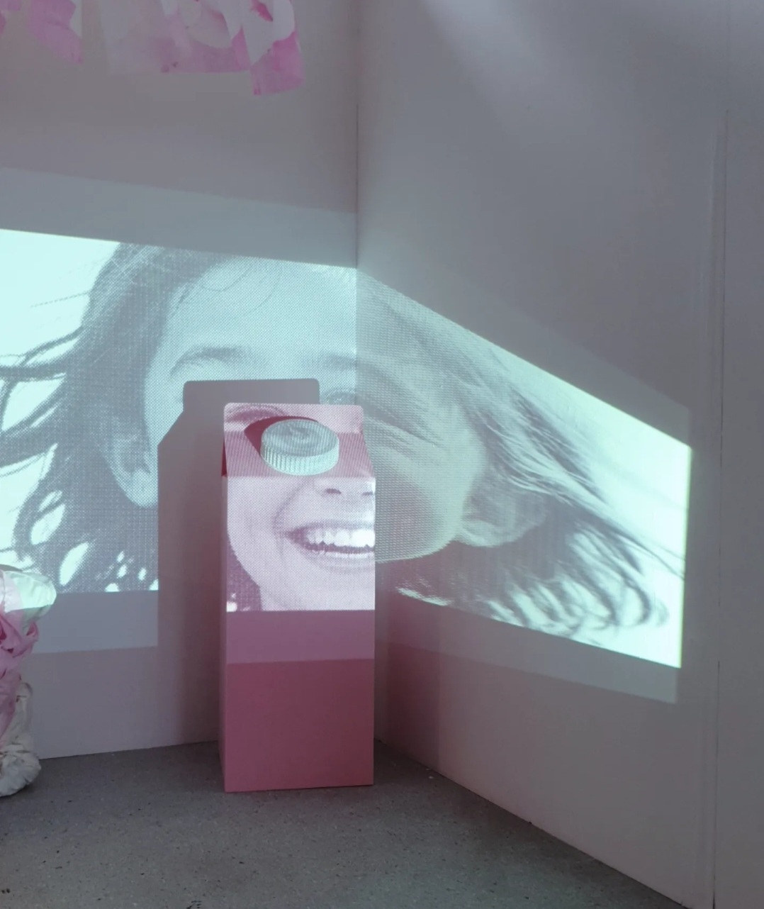 The same child’s face is screen printed on reclaimed screen gauze in Miller-Baker pink, and suspended in succession using the marbles fixings in this found object; which is an old print drying rack leant to me by a kind technician. The marbles amplify the sense of childlike innocence already present in the colour piece.