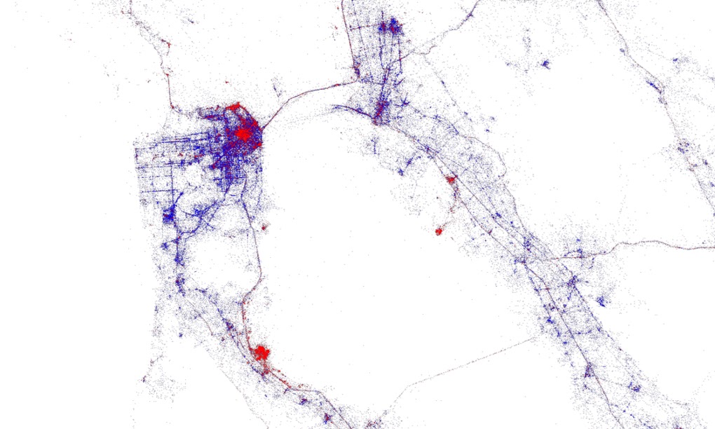 Fischer, a ‘data artist’, applies Twitter data gleaned from Gnip in the mapping tool MapBox to help visualise where temporary visitors go in cities. San Francisco (top left) and the Golden Gate bridge, for example, attract far more non-locals than Oakland across the bay. The concentration of red to the south is San Jose.